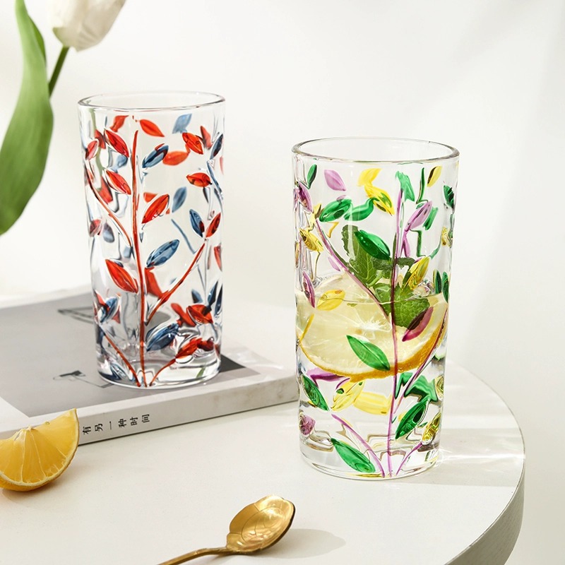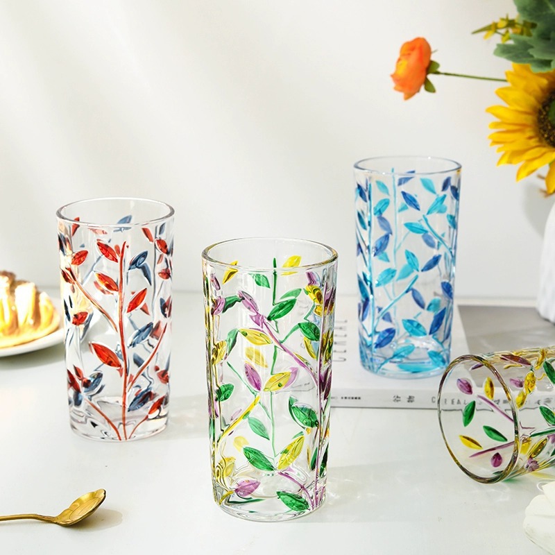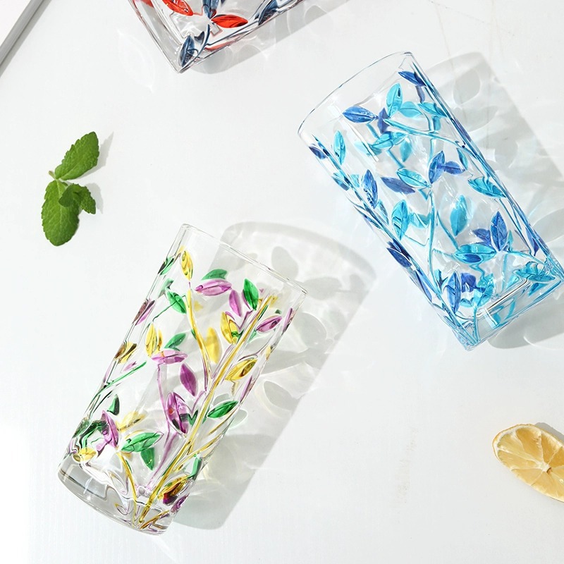 Merke: INTOWALK Produktnavn: Malt bladmønster krystallglass Håndverk: Mekanisme Materiale: høykvalitets glass Farge: himmelblå, rødblå, syv farger størrelse: Diameter 7,4 cm. Høyde 14 cm. Bunndiameter 6,2 cm. Kapasitet 355ml
